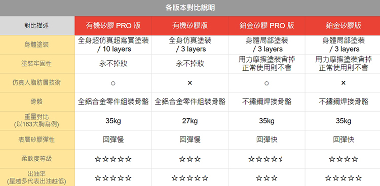星藝娃娃的Pro版採用全新的訂製工藝來模擬真人的肌膚脂肪感,讓矽膠材質的彈性仿真出真人的彈性觸感。這項擬真的工藝透過四層包覆,全鋁合金關節骨骼為核心,再以海綿層模擬肌肉,外層包裹超軟矽膠層來仿擬脂肪,最後以有機矽膠表層仿真出肌膚表面的手感。多層的肌膚工藝,提升星藝娃娃的擬真度,也提高娃娃的情趣使用體驗。