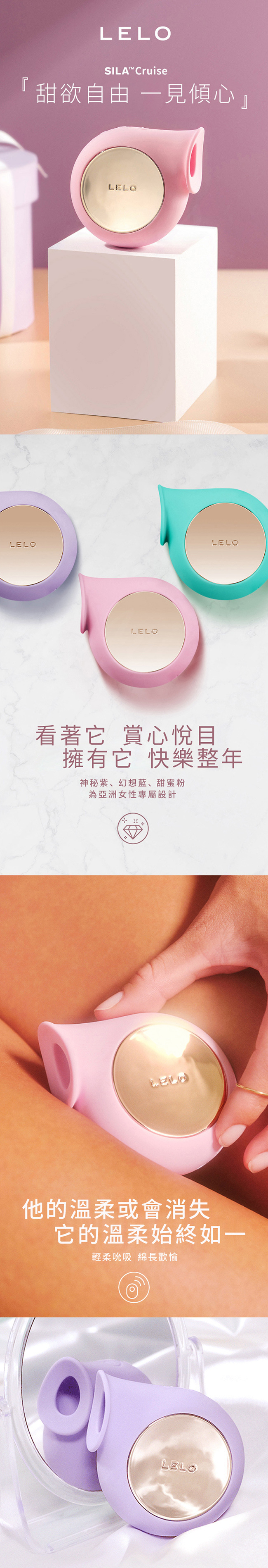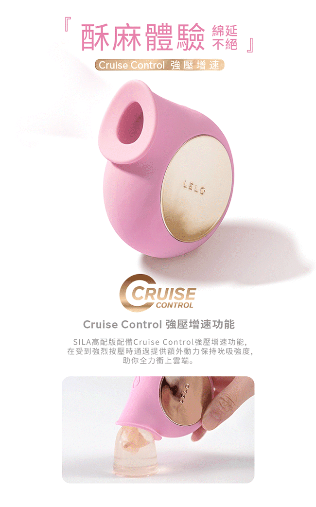 藉由LELO SILA™ Cruise 來探索妳的幻想並且重新定義高潮的意義。輕柔的波濤脈動從妳的陰蒂頂端狂湧而出,達到夢幻高潮,達到全新的體驗。LELO SILA™ Cruise 創造全新的方式來體驗前戲,對待女性自我的方式,並且挑逗、並傾聽更強烈的高潮。全新設計更柔軟、更深入的矽膠吸嘴,擁有更大的覆蓋口部,讓妳全身得到完全的滿足。嵌入 SILA™ Cruise 中的 Cruise Control™ 技術使獨特的脈動在使用過程中保持恆定,因此當它被用力壓在身體上時,會釋放出額外的力量,實現強烈、深度的釋放。