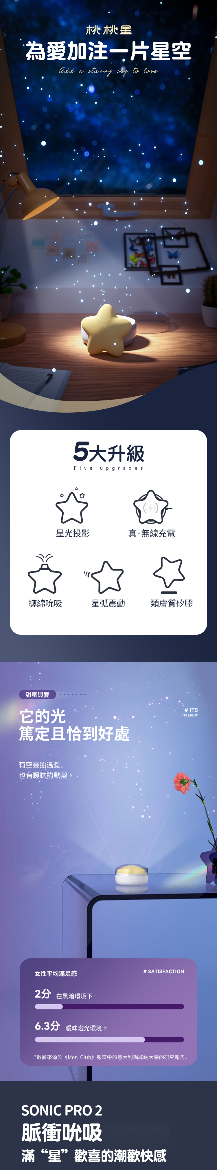 桃桃星的底座除了是無線充電艙,還是一盞浪漫的星空氛圍燈,多種不同星光頻率,可以打造屬於你自己的一片星空,把它放在床頭,星星燈投射出的點點星光,能營造出輕鬆溫馨又有情趣的環境,就像在廣闊的星空下,讓星星記錄下你每一個激情歡愉的時刻!且桃桃星同樣保有刺激的吸吮功能及震動功能,欣賞美麗星光之餘也為夜晚增添一些刺激的感受。