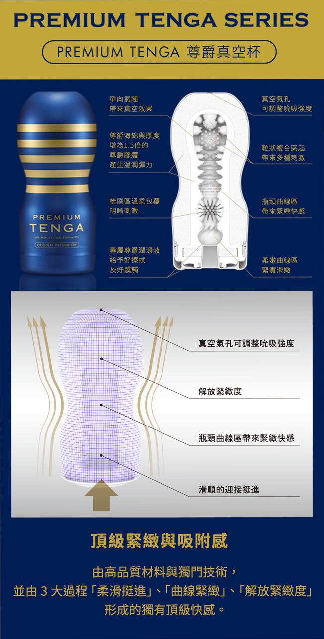 PREMIUM TENGA跟其它的CUP系列相比,搭配最高品質的膠材、綿密包覆的高級濕潤泡棉,加上易擦拭的特級潤滑液,這些全部都是最高品質的素材。為了要激發出最高品質素材的性能,而特別設計的細緻內部結構,比起其它的CUP系列能享受更上一程樓的吮吸快感。