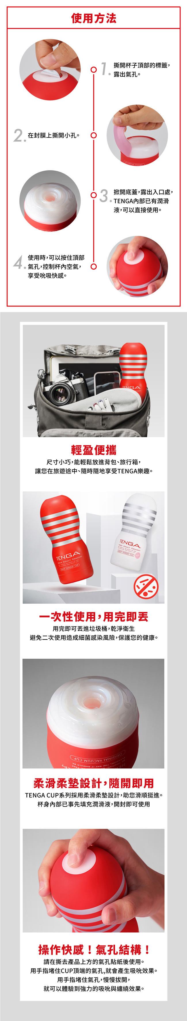 可以透過手指堵住和放開氣孔的方式來調節吸引力。請在首次使用前剝掉貼在CUP系列上面的圓形貼紙後再開始插入。在插到底的時候堵住氣孔,然後就這樣直接抽出後,會因內部的真空壓力而產生被內部吸附著的包覆感。然後依據自己的喜好來調節真空的感覺,就能獲得前所未有的快感。