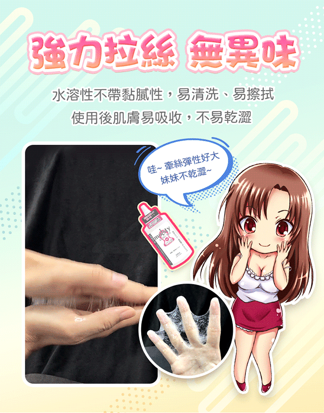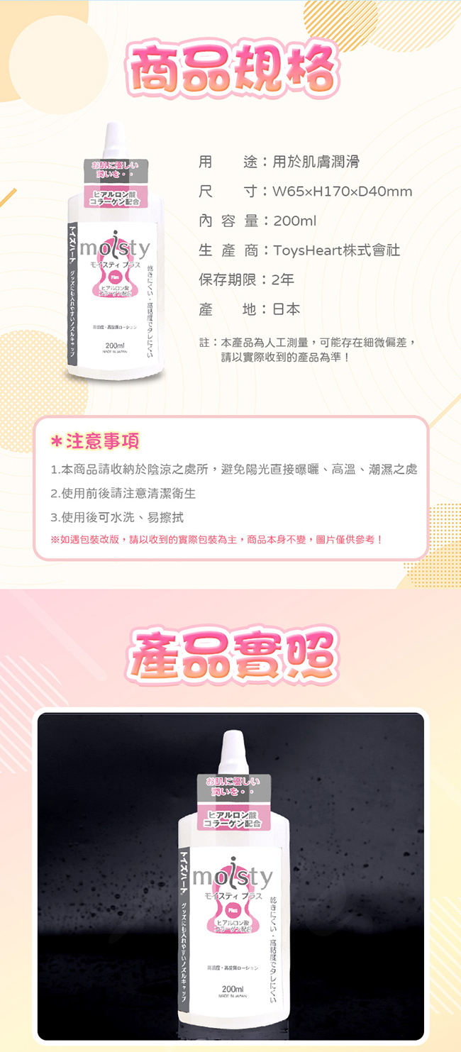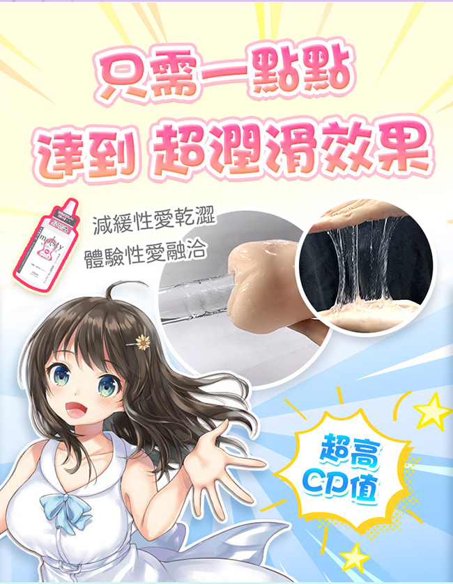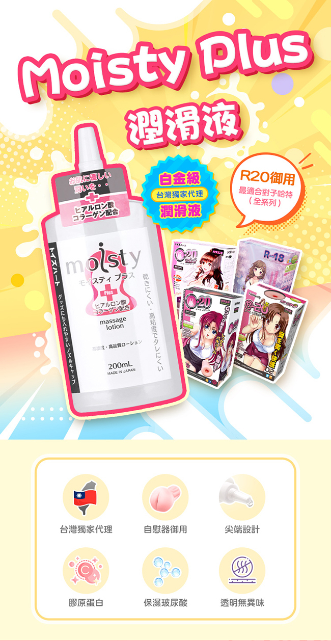 TH對子哈特推出經典款潤滑液 moisty Plus 200ml,不僅濃度高擁有強大拉絲效果,其中添加了膠原蛋白及玻尿酸等保養保濕成分,使得潤滑效果更長更久。且只需一點點,即可達到超潤滑效果,減緩性愛乾澀,讓人更加體驗性愛美好!